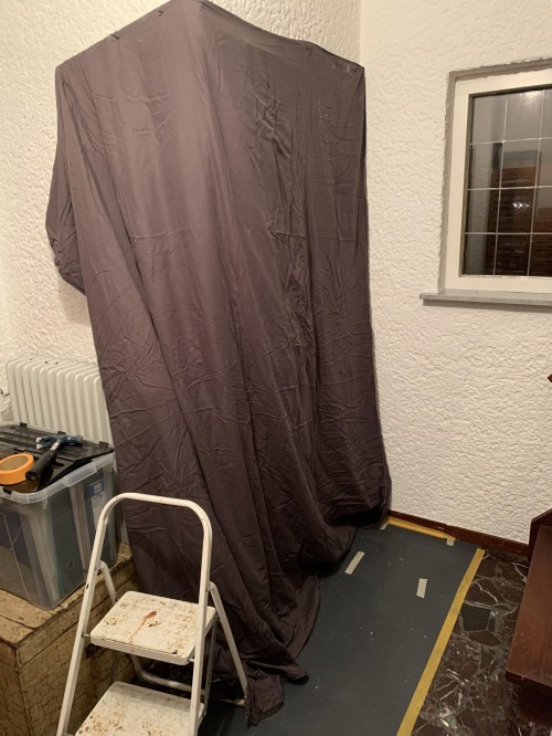 Omdat ik morgen wil starten met slopen heb ik alvast een doek gehangen en wat stucloper neergelegd zodat ik naar buiten kan met het puin en dan niet al teveel rotzooi maak. Het doek wat een oud overtrek is hangt met latjes hout tegen de muur gespijkerd. Dat geeft wel gaatjes, maar dat is niet erg want die muren willen we toch nog laten stuccen zodat het strakke muren worden.