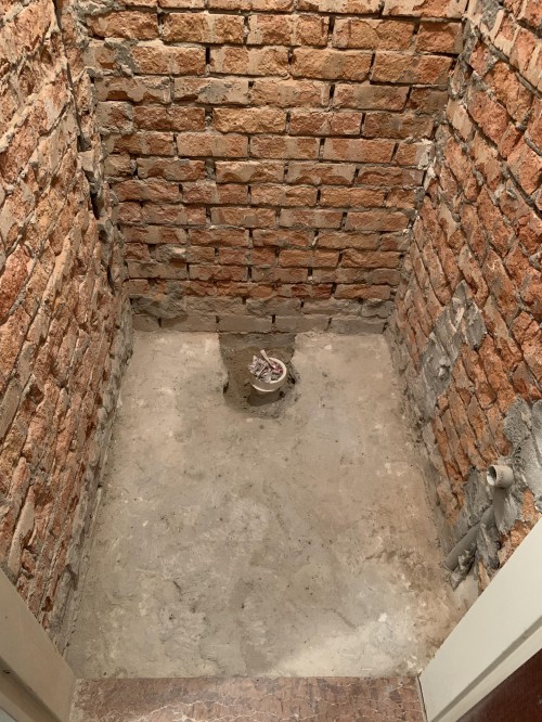 Morgen komt de loodgieter en dus moest ik vanavond nog even aan de bak. Bij Ben had ik een hakhamer gehaald en een kiepertje zodat ik de puin kon afvoeren. De vloer was er zo uit en toen was het nog even zaak om het netjes op te ruimen. Omdat er een hangend toilet komt is er een sparing in de beton naar achter gemaakt zodat de riolering verplaatst kan worden.