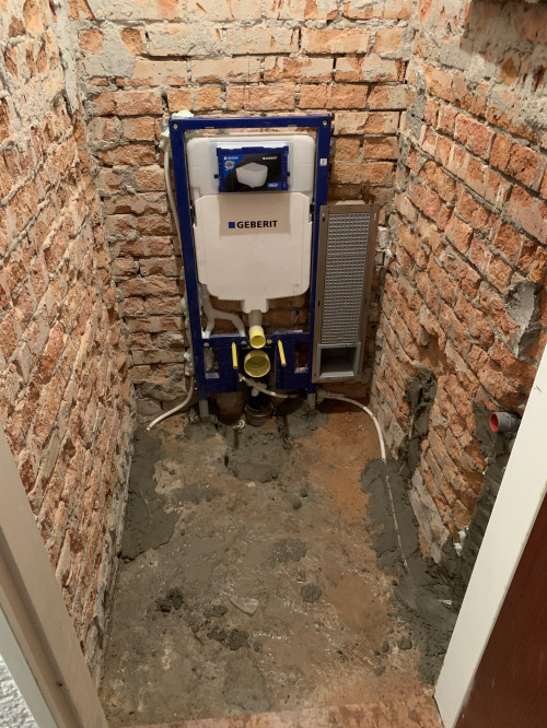 Nu het sloopwerk klaar is kan er met opbouw begonnen worden. De loodgieter heeft de stortbak geplaatst en de wc-rolhouder vast als voorbeeld vast gemaakt. In de muur zijn een paar stenen weggehaald om de lekkage op te sporen die in de muur zit. Op dit moment denken we dat het lek in de afvoer zit in de badkamer erboven. Volgende week gaan we boven de muur een beetje openmaken om te kijken of we er daar bij kunnen om het lek te repareren want om iedere dag een emmer leeg te maken bij de ketel daar zit ik niet op te wachten.