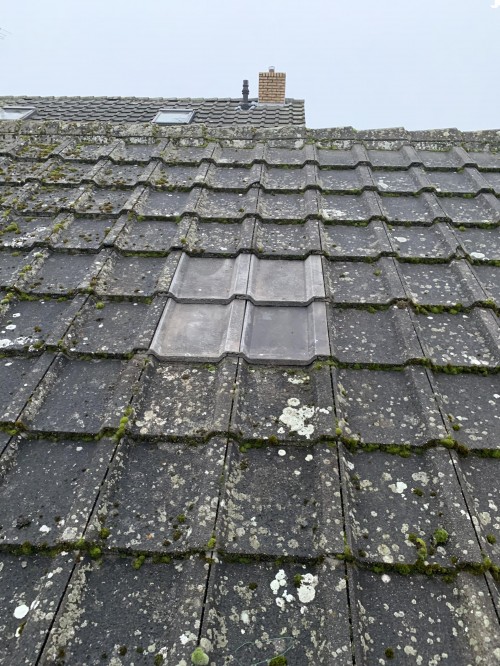 Het raam was kapot en tip van de schilder om het even dicht te maken met een paar dakpannen die we nog genoeg hebben liggen. Dus zo gezegd zo gedaan!