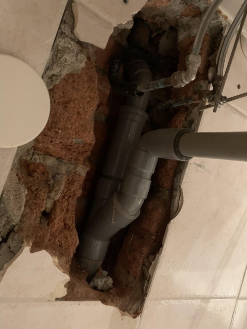 Sinds de ketel aangezet was in het nieuwe huis is er iedere dag ongeveer een emmer restwater uit de ketel via de afvoer in de spouw gelopen. Met wat speurwerk zijn we erachter gekomen waar het ongeveer zat en vandaag had de loodgieter een gat in de muur gemaakt om te kijken waar het probleem zat. Met slechts één tegel verwijderen was hij op de juiste plek bij een T-stuk wat kapot gegaan is.