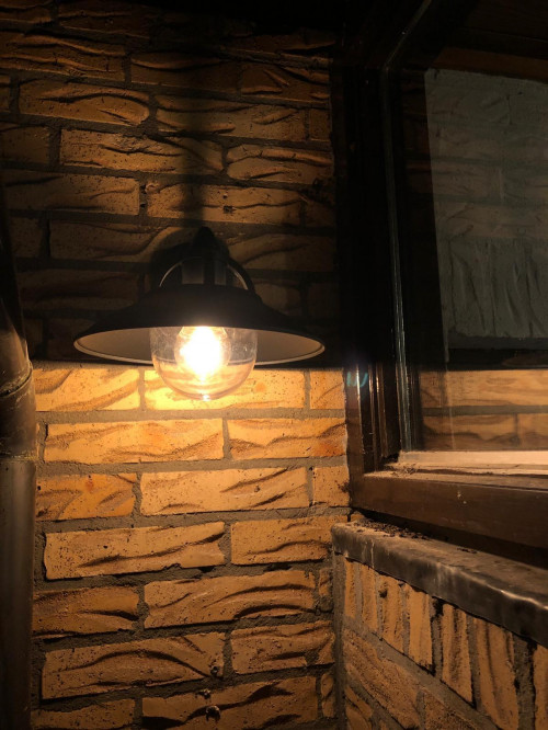 Het was al donker en het regende, maar Yvie wilde graag de nieuwe lamp opgehangen hebben dus heb ik dat, maar gedaan.Met druppels water die in mijn gezicht vielen van de dakgoot die lek is was geen pretje, maar het is gelukt en hij doet het!