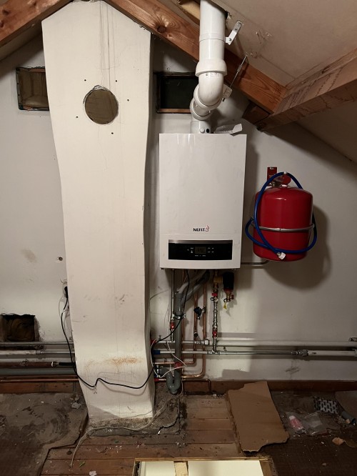 Vandaag wordt eindelijk de ketel geïnstalleerd zodat we ook warm hebben.