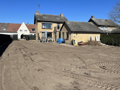 Uiteindelijk had Pascal de hele achtertuin gedaan en met het machien vlak gezet. Later moeten we dit nog met een laser vlak zetten, maar daar moeten we nog een goede hoogte voor bepalen. Het grootste deel willen we dichtleggen met gras met een rand er omheen voor planten en/of bomen. De voortuin moet nog aangepast worden, maar wanneer dat gebeurd is nog niet zeker.