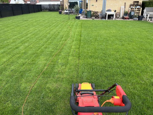 Tsja, dan heb je een mooie grasmat liggen, moet die ook gemaaid worden! Bij Indra en Ries mochten we de grasmaaier lenen en die ben samen met Lilly even gaan halen. Daarna de kabel uitgerold en aangesloten en begonnen met maaien. Drie keer moest ik de zak leeggooien in de kliko en toen was het gras weer mooi kort. De kantjes kan ik nog niet doen want daar heb ik nog geen kantenmaaier voor maar die moet er toch eentje komen ook als straks de robot maaier er is.