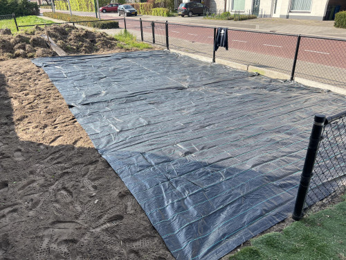En als laatste worteldoek erover zodat het straks niet helemaal vol onkruid staat.