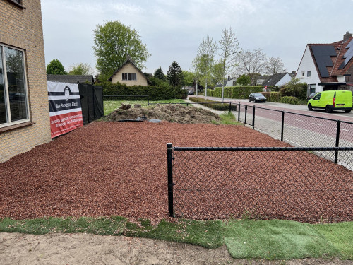Nadat Yvie heel hard gewerkt heeft om alle doppen uit de BigBags te halen en te verspreiden heb ik het nog een beetje verder vlak gemaakt en vervolgens gesproeid zodat het minder makkelijk weg zou waaien. Zelf zijn we heel tevreden met het resultaat en hopelijk blijft het nog lang onkruidvrij.