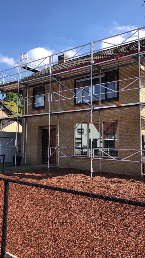 Omdat er volgende week begonnen wordt met ons nieuwe dak hebben ze het gisteren en vandaag in de steigers gezet.