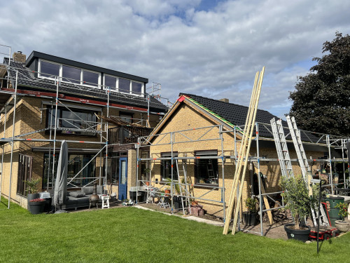 Inmiddels staat de garage ook in de steigers zodat ze er beter bij kunnen met afwerken.
