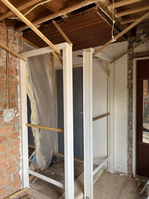 Inmiddels zit de electra erin en ook de kozijnen zijn gesteld zodat Sander het tegelwerk kan gaan doen.