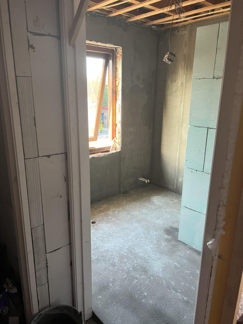 Er is weer hard gewerkt door Sander vandaag en de open ruimte begint dan ook alweer steeds meer op een badkamer te lijken.De wanden zijn vlak gemaakt en alles in voor gesmeerd zodat Sander de volgende dag met tegelen kan beginnen.