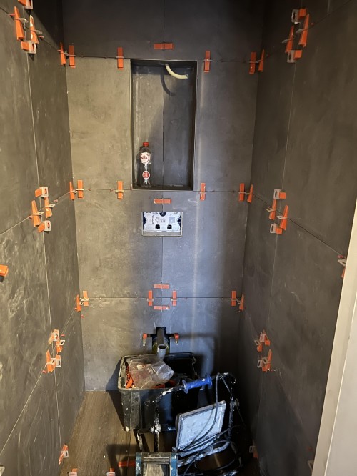 Morgen doet hij het voegwerk en dan kan de loodgieter de wc installeren en hoeven de kinderen niet meer naar beneden midden in de nacht als ze moeten plassen!