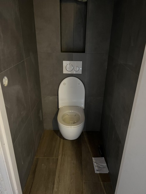 Nu de tegels erin zitten en gevoegd kon Rob de wc-pot hangen zodat we eindelijk weer boven naar het toilet kunnen. Dat laatste is met name voor de kinderen handig want dan hoeven ze niet meer naar beneden midden in de nacht met hun slaperige hoofden.