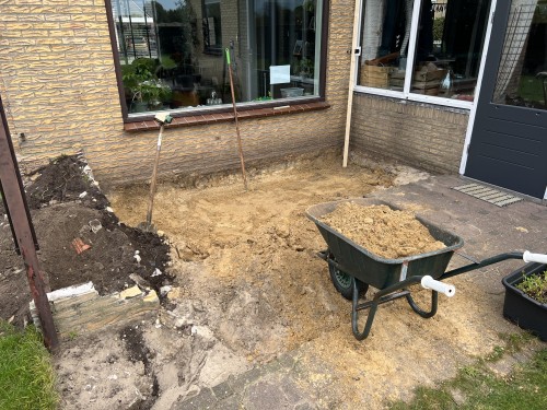 Omdat volgende week met de fundering gestart gaat worden moet ik het grondwerk ervoor maken. En omdat er ook nog een bloembak staat waar het moet komen moet die ook nog weg.