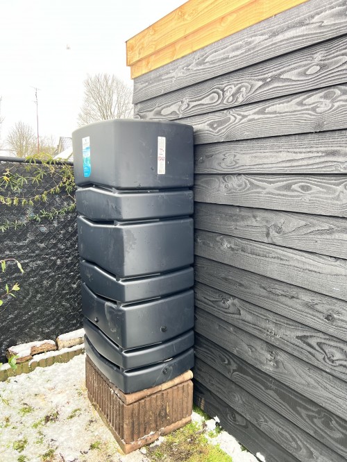 Het is een ton van 650 liter dus dan hebben we mooi een voorraad water voor als het minder regent.