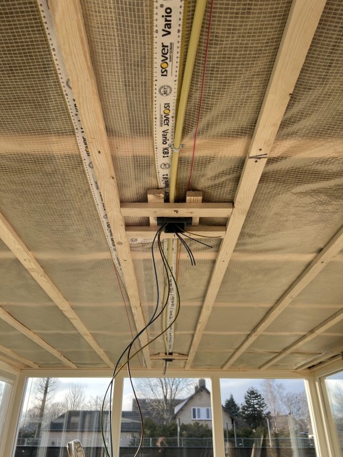 In de aanbouw willen we ook wat licht hebben dus moeten er buizen en draden in!Helaas had ik niet al het gereedschap in huis om het helemaal te maken maar het begin is er.