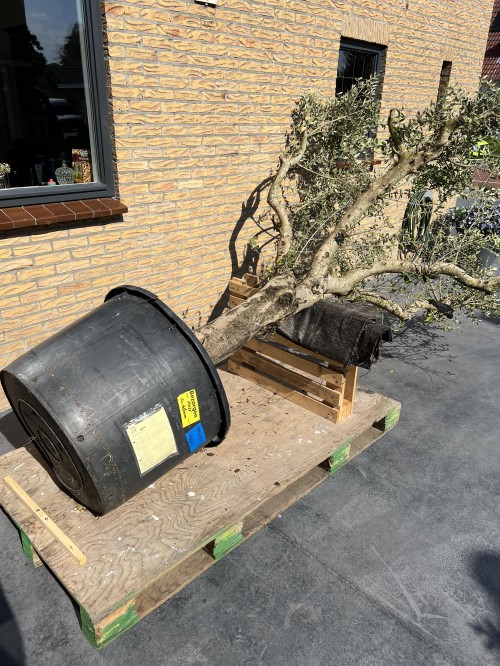 Dus stond er zaterdag morgen een boom op de oprit van 400 kilo of nog zwaarder.