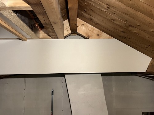 Maar om deze op de zolder netjes op te kunnen hangen en later ook de dakkapel netjes af te kunnen werken moest er een plaat gezet worden. Degene die ik nog had liggen waren niet netjes, dus ben ik er eentje gaan halen en heb deze op maat gemaakt.