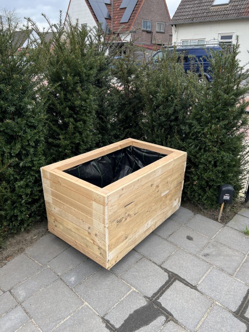 Grote bloembakken kosten veel geld dus heb ik er maar eentje zelf gemaakt met afvalvoorziening van pallets. Deze heb ik van de buren die allemaal aan hun huizen bezig zijn en er toch vanaf moeten.