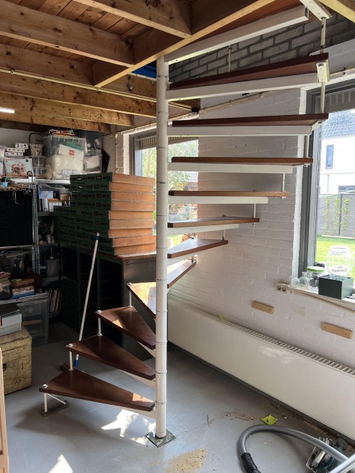 Toen moesten we hem nog in de garage inbouwen en dat koste toch wel 2 dagen werk maar dan heb je ook voortaan een vaste trap naar zolder in de garage. Dan gebruiken we die ruimte ook wat meer.
